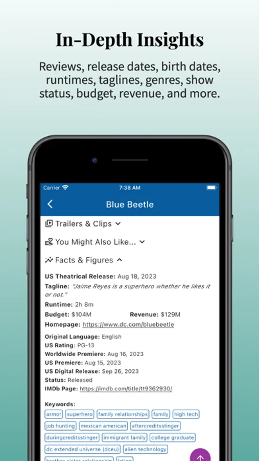 - *In-Depth Insights* -- Access detailed information like community reviews, dates (birth, death, air, release, etc.), runtimes, taglines, genres, show status, budget, revenue, and much more.