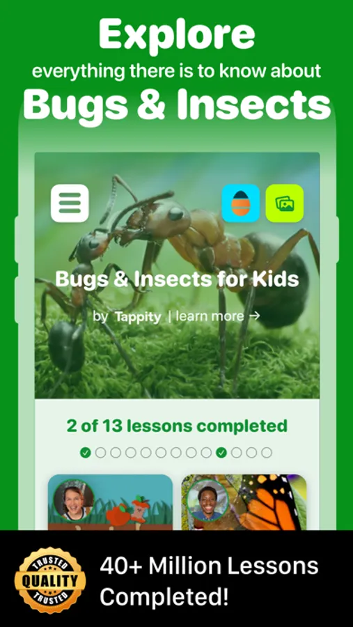Learn everything there is to know about insects through fun interactive video lessons! By the makers of the #1 science app for kids and trusted by over 100,000 families around the world.