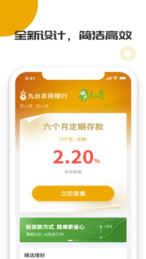 “九台农商银行直销银行——九商金融”是九台农商银行倾心打造的全新的金融服务渠道,主要通过手机客户端等渠道进行办理,客户可直接在互联网上办理银行业务诸如:存款、贷款等金融产品。使用起来便捷高效,让您一站式尽享贴心服务。