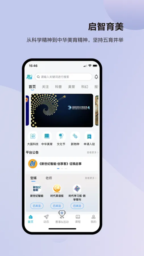 凤凰少年智APP将推出一批面向青少年的科普和美育课程,开发一批适合青少年参与的科学与艺术活动与赛事,完成“趣说科学”“艺术殿堂”等课程,开展科学与想象力训练营、数学文化节、“凤凰少年智”小编辑评选等活动。