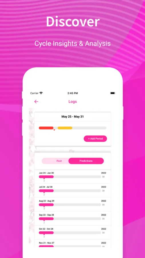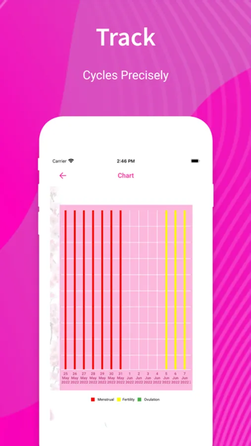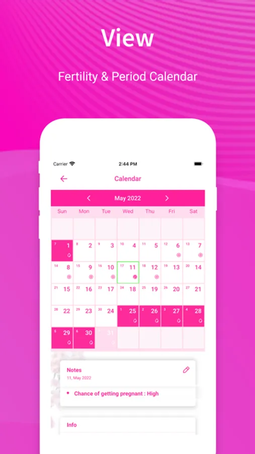 • Represents your fertile and ovulation days with a chance of pregnancy in the calendar.