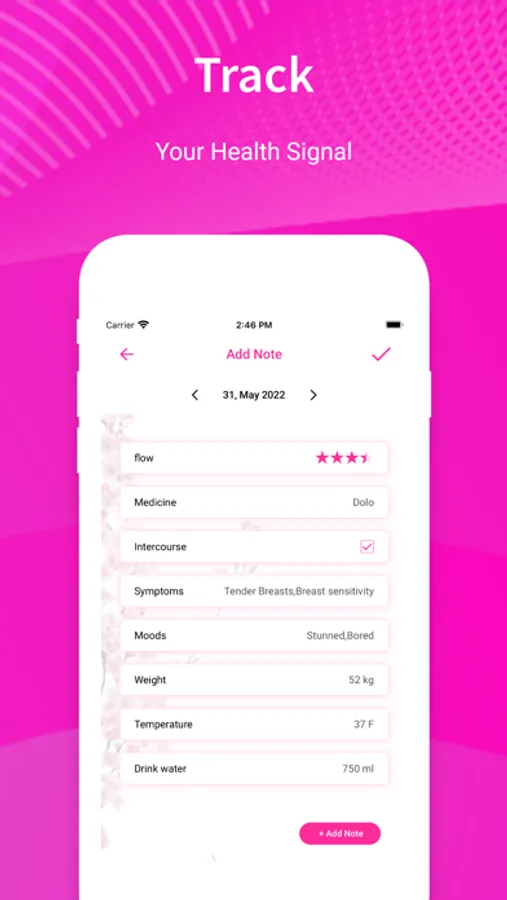 With our app, you can enter daily notes and track symptoms, moods, intercourse, period flow, results of ovulation test, and a pregnancy test.