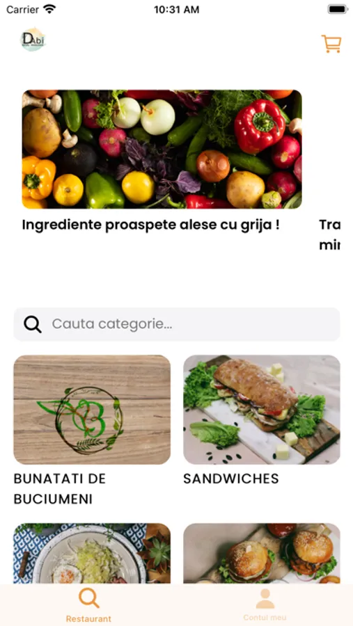 Utilizând aplicația Dabi, bucatele delicioase ajung mai repede la tine și întreg procesul este atât de simplu! Selectează din meniu preparatele dorite, adaugă în coș, alege metoda de livrare/plată și trimite comanda - nimic mai ușor! Descarcă acum app Dabi pentru a transmite întreaga comandă online, într-un mod modern, direct, rapid și eficient!