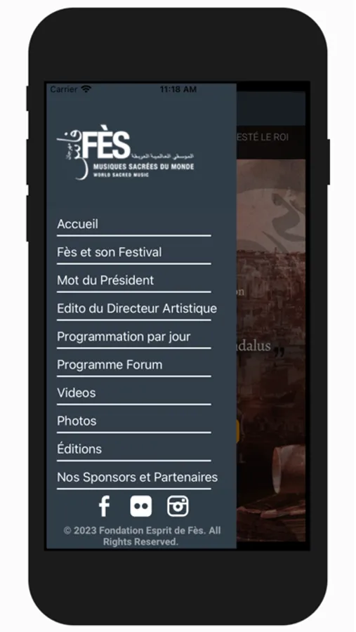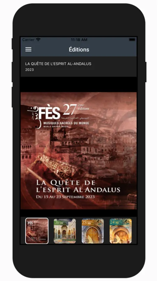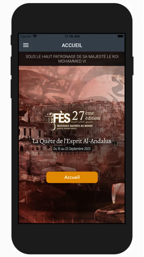 Cette application a pour but de présenter le Festival de Fès des Musiques Sacrées du Monde et sa programmation du vendredi 15 Septembre au Samedi 22 Septembre 2023 avec comme thématique « La Quête de l'Esprit Al-Andalus ».
