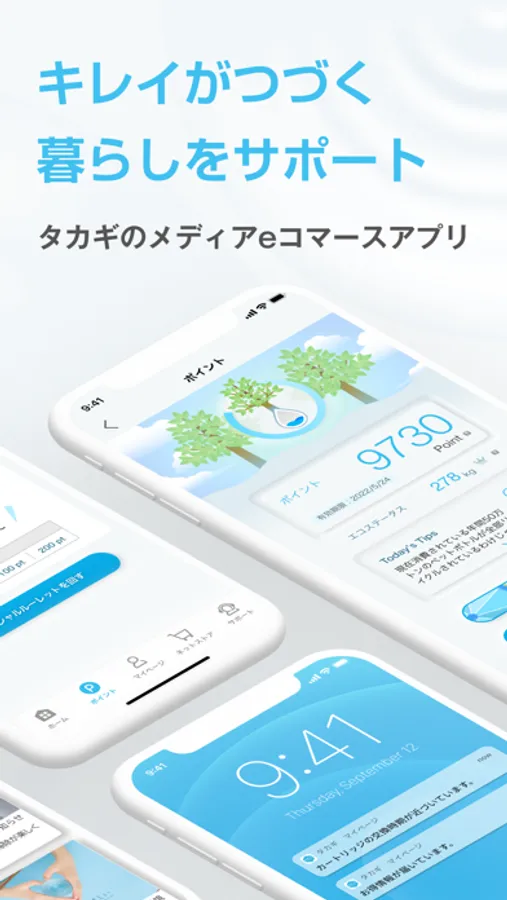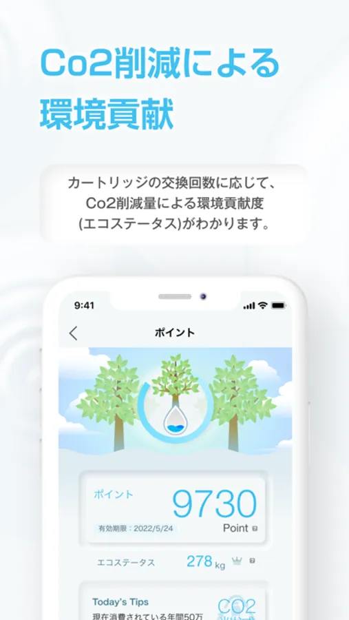 浄水器を使うことはCo2を削減することにもつながります。浄水カートリッジの交換回数によるCo2削減量に応じて、エコステータスが変わります。Co2削減に貢献するとプレゼント当選率がUPしたり限定のキャンペーンに参加できます。