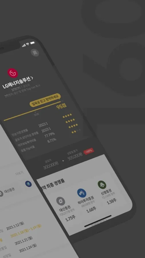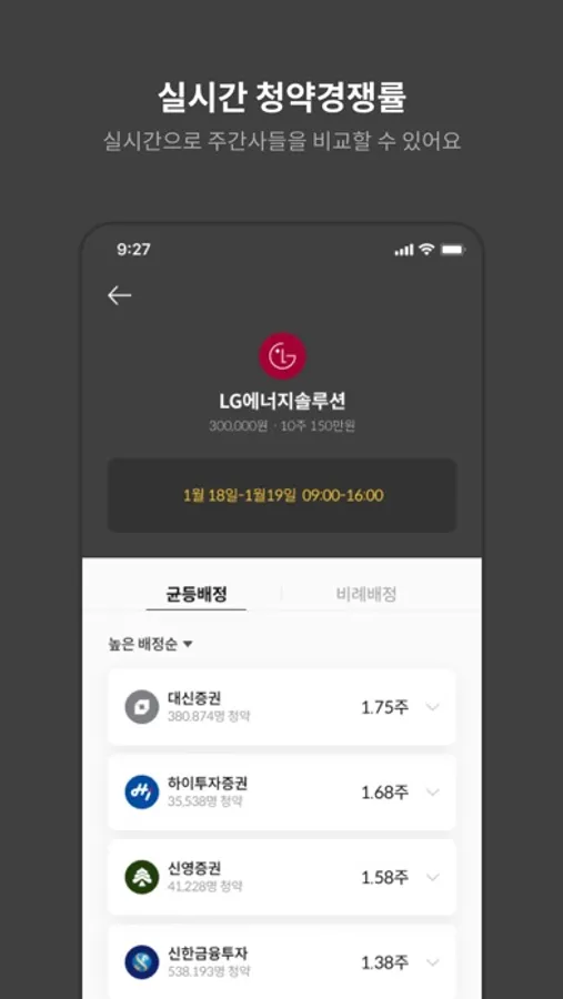 증권사별 균등배정/비례배정 청약 경쟁률을 실시간으로 확인하고 유리한 증권사에 청약을 할 수 있어요.