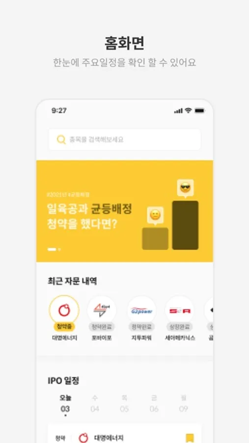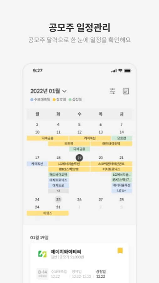 공모 일정을 캘린더로 한 눈에 확인하고, 관심 있는 종목을 찜해서 따로 모아 보실 수 있습니다.