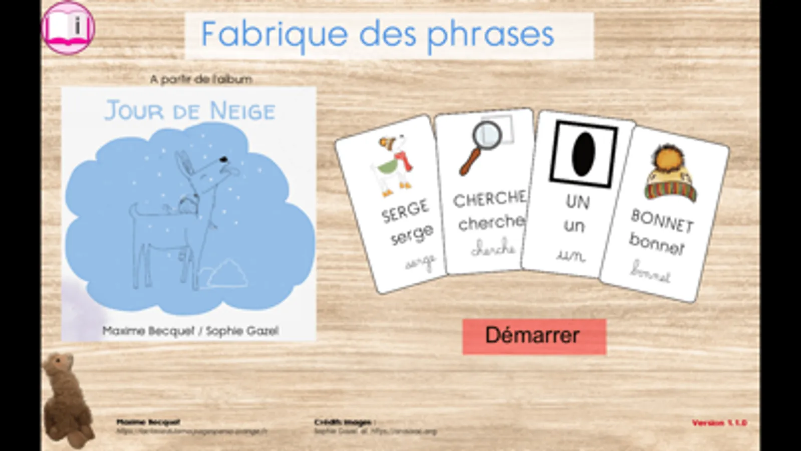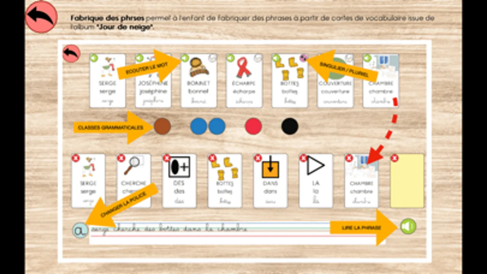 L'application permet de fabriquer des phrases autour de l'album interactif "Jour de neige" (application disponible gratuitement).