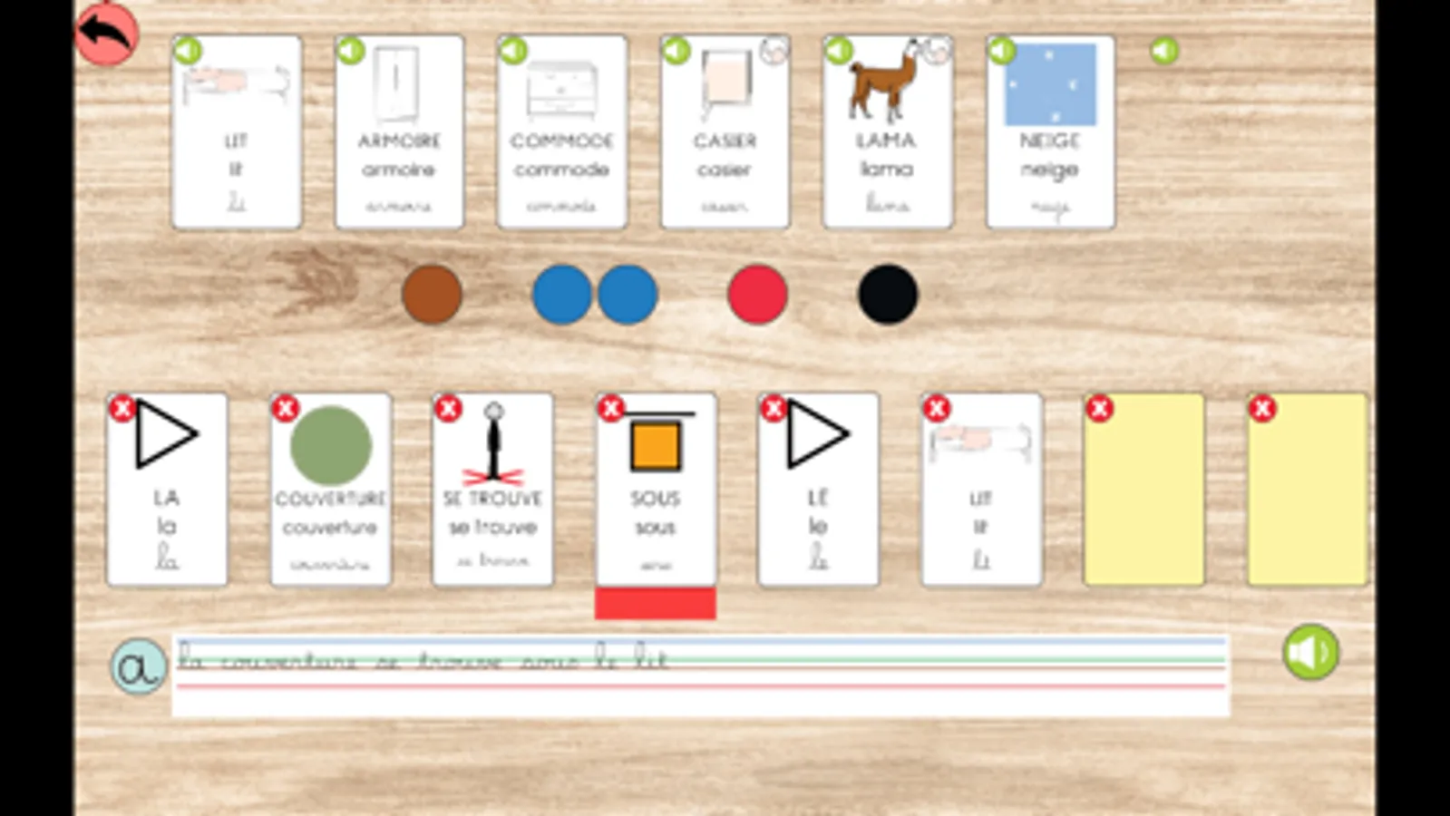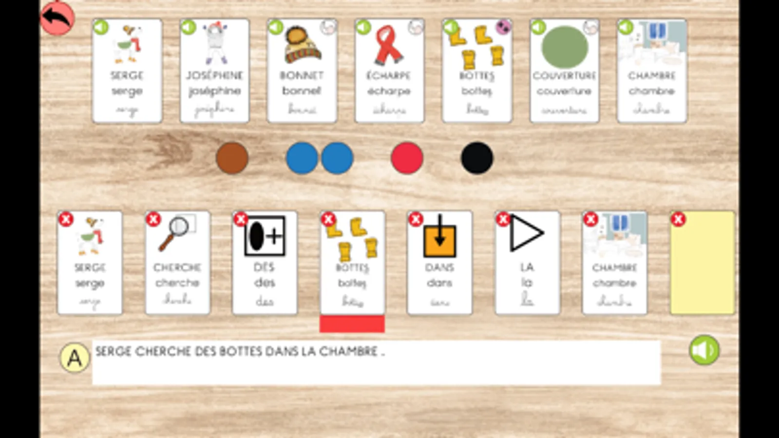 Glissez des cartes parmi les différentes collections (déterminants, noms, verbes...), puis écoutez la phrase construite !