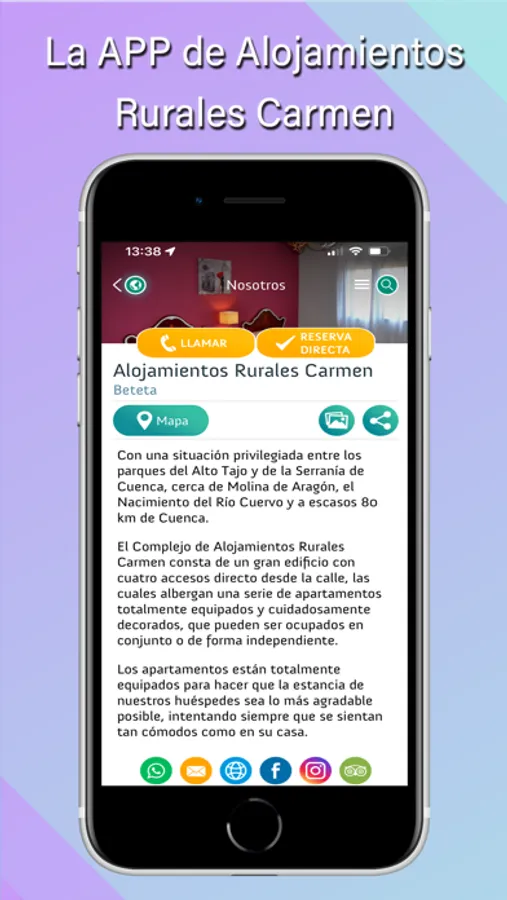Cuenta además con un sistema que te permitirá marcar todas tus opciones favoritas para planificar mejor tus vacaciones. Con nuestra guía de Alojamientos Rurales Carmen en Beteta, Cuenca, podrás encontrar los mejores sitios de la zona. A través de su buscador de recursos puedes escribir lo que buscas y la app de informará en cada caso donde puedes encontrarlo.