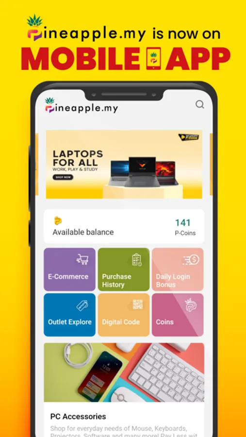 Get rewarded with P-Coins everyday from Login to Pineapple e-Store (Pineapple.my) App, to shopping for Printing Solutions, Laptops, Desktop PCs, Monitors, Gaming Gears and many more
