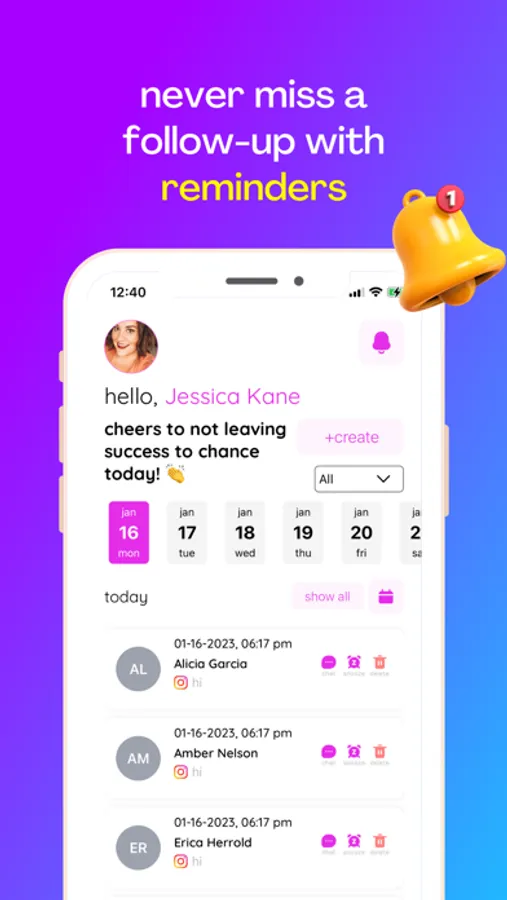 Never miss the follow-up by using geniechat reminders! Create one-time, recurring or templated reminders and we will send you a ping when it’s time to send.