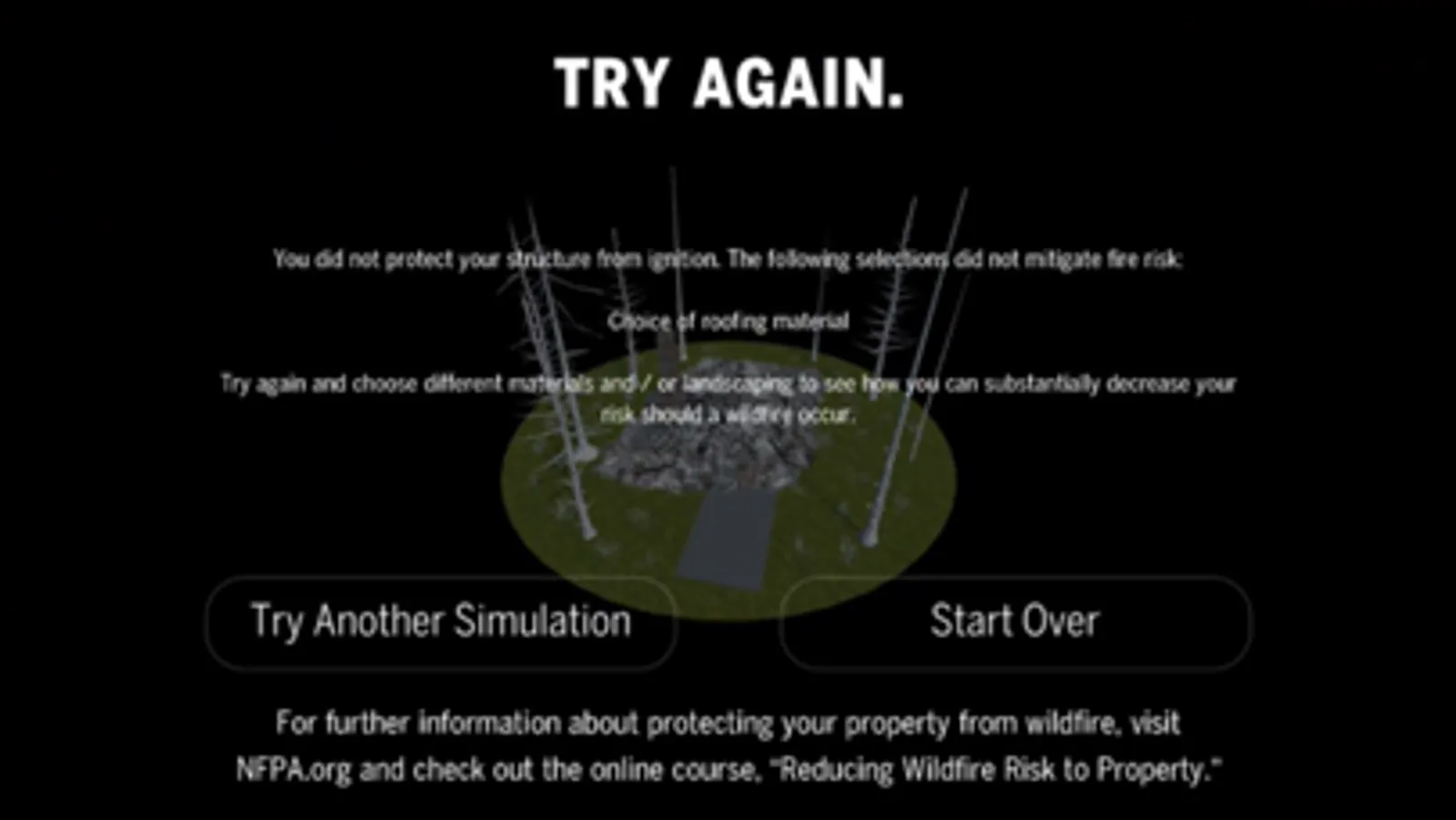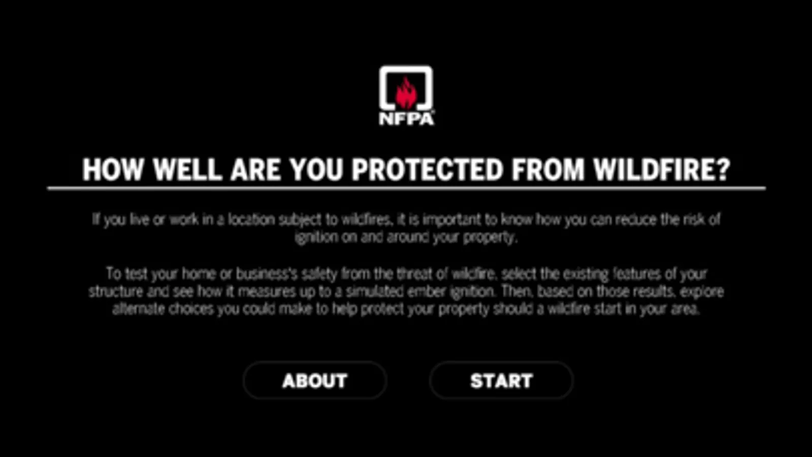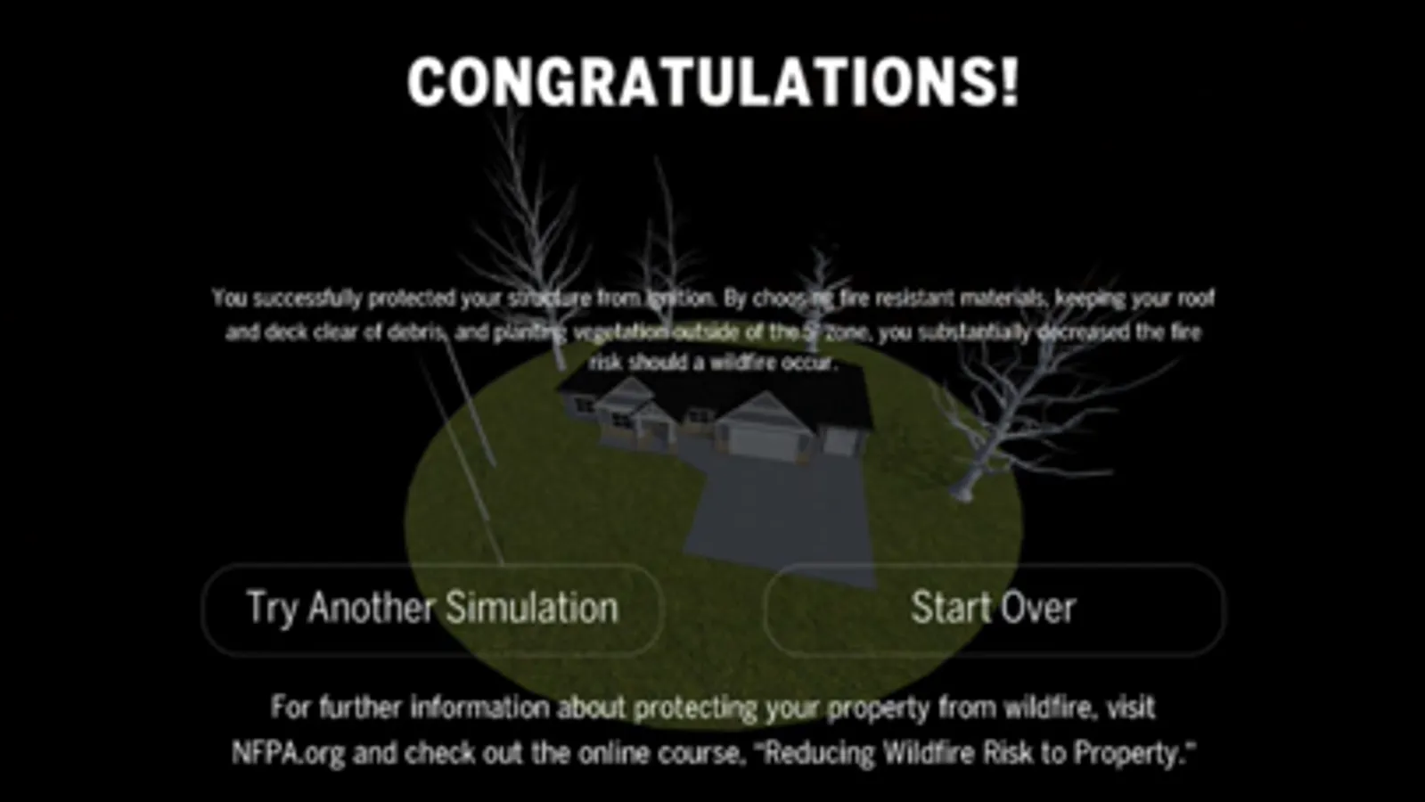 DISCLAIMER: The sole purpose of this simulation tool (“tool”) is to circulate information about some ways to help reduce wildfire risk. The tool cannot account for all factors that affect wildfire risk and anyone using this tool should rely on his or her own independent judgment or, as appropriate, seek the advice of a competent professional. It is provided AS IS and AS AVAILABLE without guarantee or warranty of any kind and without representation or warranty regarding the accuracy, completeness, usefulness, timeliness, reliability or appropriateness. NFPA assumes no responsibility or liability in connection with the information contained in or expressed by this tool, its use or output.
