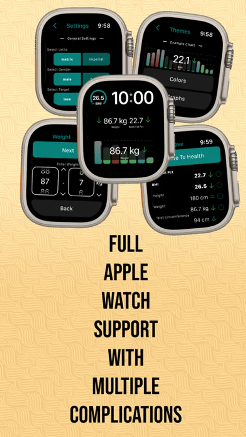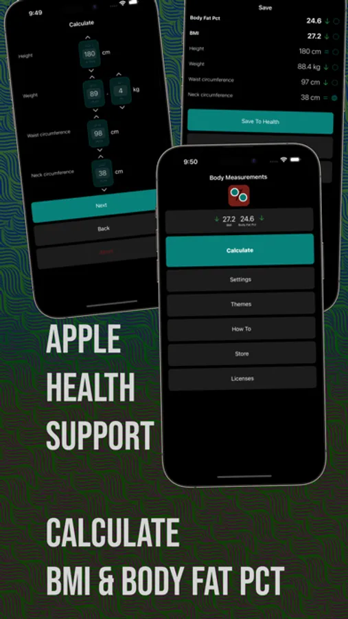 Calculate and save your BMI and Body Fat Percentage simply by measuring your weight and body circumferences.