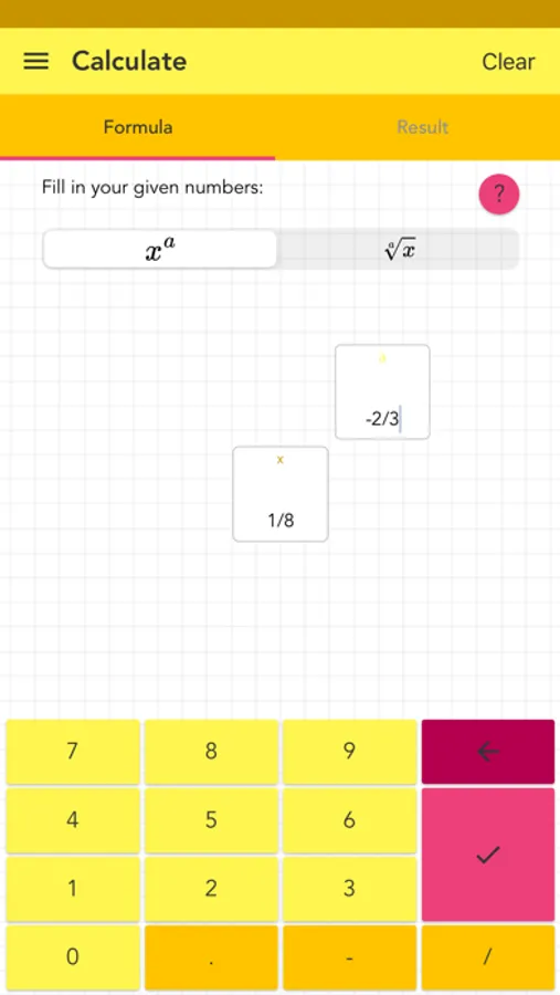 - if exponent or base are missing, the relevant field is highlighted in yellow