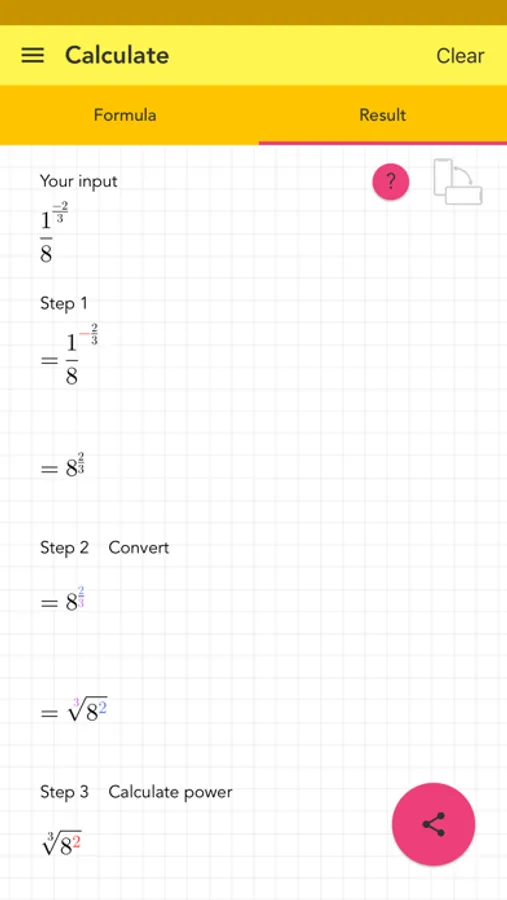 Decimals, fractions and negative values are supported. The solution is shown step by step. All calculations are stored in the history. The final solution can be shared.