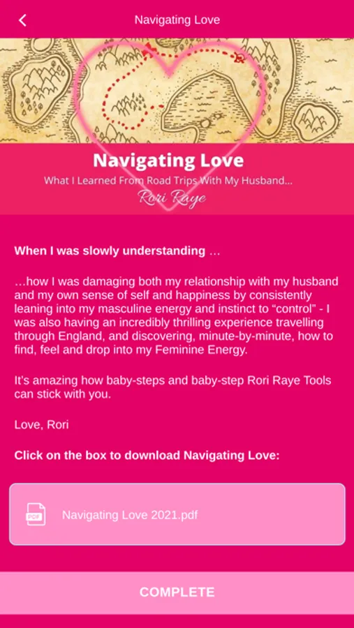 You'll find videos, lots of written Feminine Energy Guides for your unique situation (the "What To Say to Him" Guide is included), and a special "Highway Of Love" audio that's exclusive to the RR App!