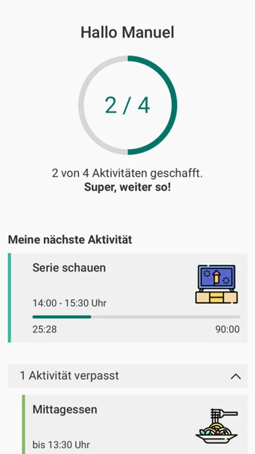 Diese App gibt dir eine Übersicht über deine geplanten Aktivitäten und kann dich an unerledigte Aufgaben erinnern.