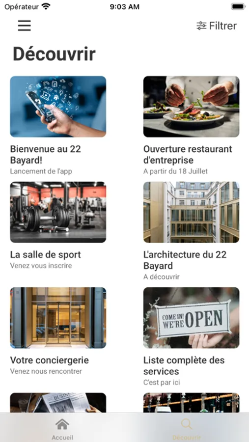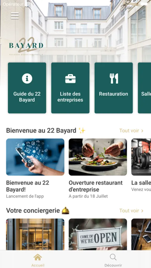 Accédez à tout les services et informations clefs de votre immeuble 22 Bayard. Réservez une salle de réunion? Un créneau à la salle de sport? Voir le menu du jour? C'est facile et accessible en un seul clic depuis l'application 22 Bayard.