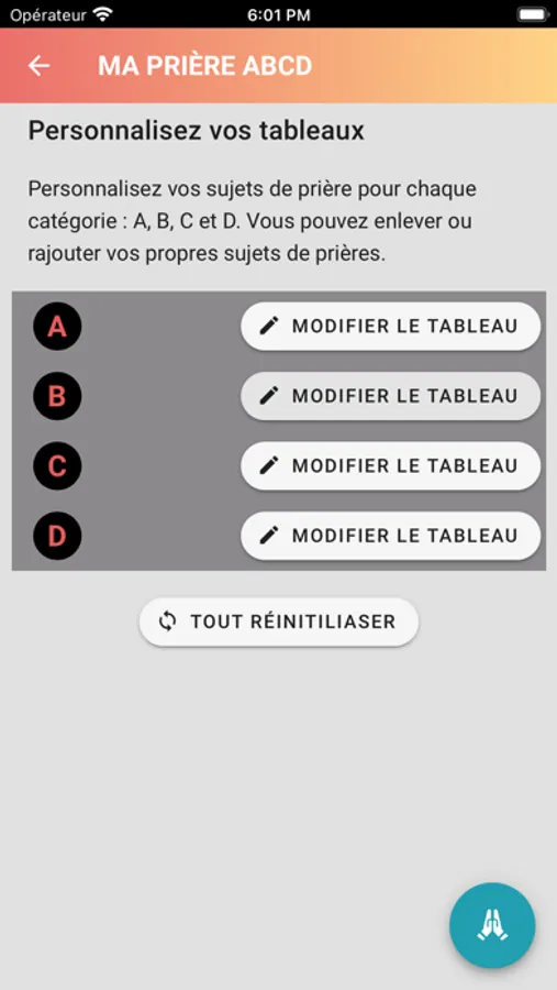- Apprendre à prier : avec un parcours vidéo et un outil pratique de tableaux de prière en 4 lettres ABCD ( Adoration, Bénédiction, Confession et Demande)