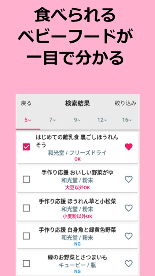 ベビーフーズではクリアした食材をチェックボックスで記録できるようになっており、その食材リストをベビーフードの膨大なデータベースと照らし合わせることにより、食べられるベビーフードは「OK」、食べられないベビーフードは「NG」と表示してくれます。