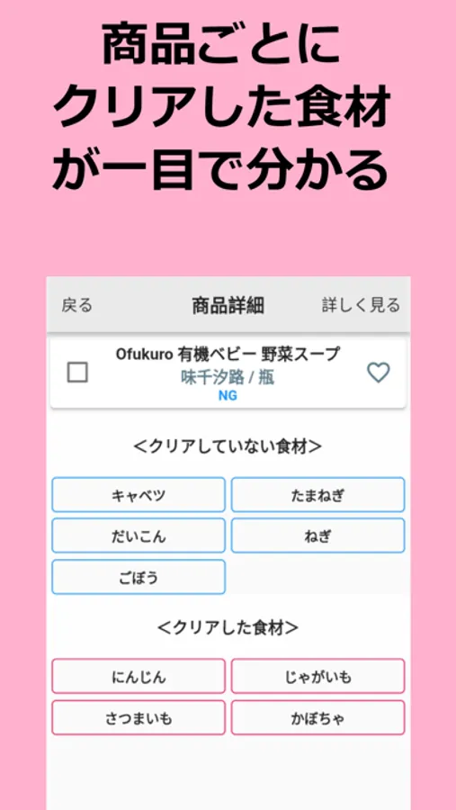 そのためNGと表示されたベビーフードについても、どの食材をクリアしていないかがひと目でわかるようになっています。