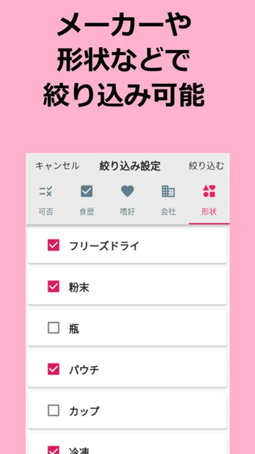 ベビーフードの検索結果では、「メーカー」や「形状(粉末、パウチなど)」だけでなく、「食べられるかどうか」、「食べたことがあるかどうか」、「お気に入りかどうか」の計5つの項目で絞り込みが可能です。