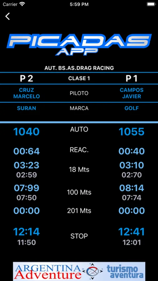 Aplicación para Picadas de Autos y Motos, funciona para autódromos o picódromos donde se tienen instalados equipos de medición de tiempo y software compatibles con la misma, y permite visualizar el estado de la competencia, los tiempos parciales de cada tirada, y los puntajes de los pilotos.