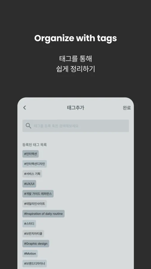 등록한 영감을 태그와 함께 추가한다면, 나중에 등록한 태그가 필터링돼요.
