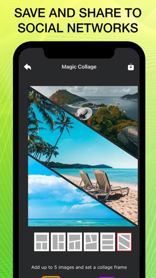 Combine up to five photos into one beautifully framed picture. Then save your collage and share share with friends on Instagram, Facebook, Messenger, WhatsApp, Twitter, etc.