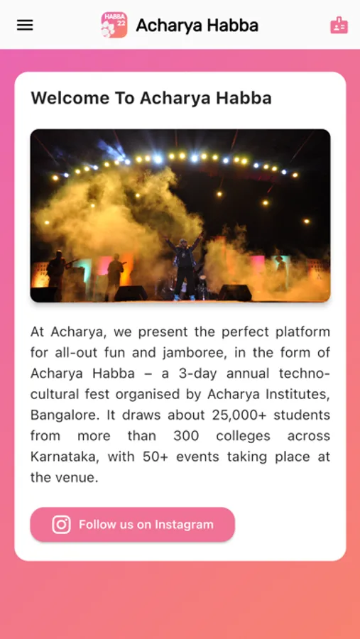Acharya Habba is a kaleidoscope of talent, expressed through a spectrum of performances that involves music, dance, drama, sports, techno Logical prodigies with a tinge of competitive air and lots of cheer, diligence, and ecstasy all around us. The fest harbors silver, gold, or platinum sponsor titles with perks being provided accordingly, along with onlookers standing steadfast with awe and admiration at the splendid sight before them.