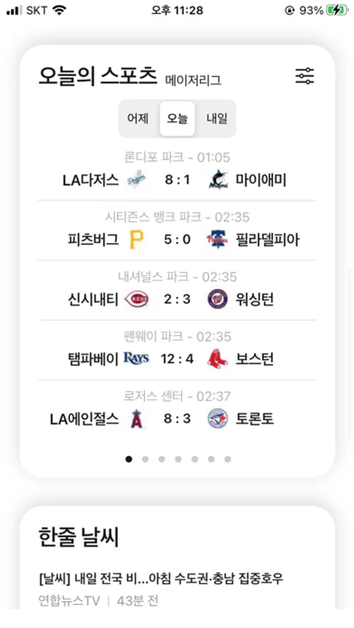 어제, 오늘, 내일의 스포츠 경기 결과들을 한 눈에 볼 수 있습니다.