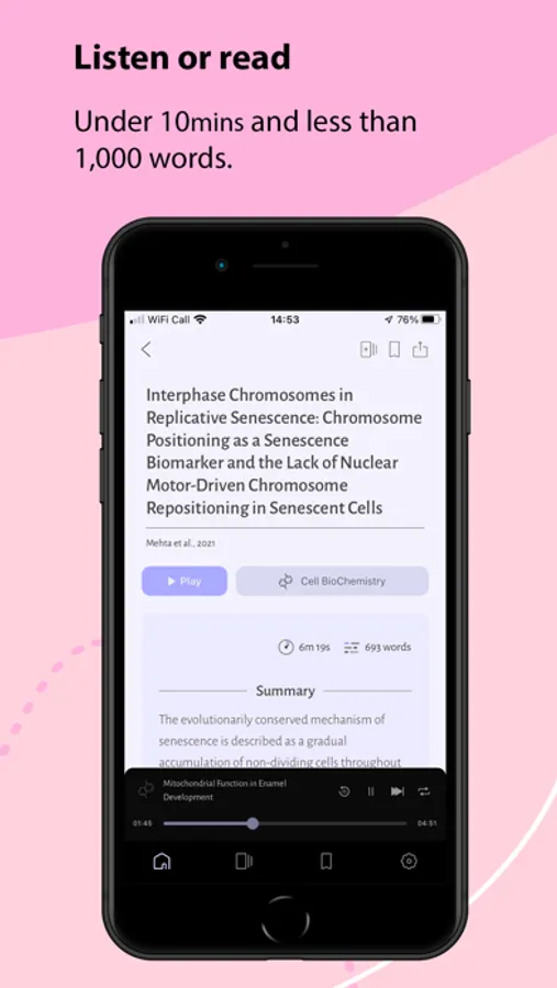 Provides a summarised form of journal articles in both audio and text with a human touch, all under a 10-minute listen or 1,000-word read. There are links to the full-text publications, and we do not change the meaning of anything, so it is just like you are at the source. We select only original research and open-source. Enjoy curated content by experts, monthly topic picks, a weekly feature that is FREE for all, and our newest content Pubcast with is a concise version of podcasts for researchers. Pubcast is about unearthing controversies, discoveries and addressing the uncomfortable topics in research. It's the stuff you should know as a researcher. Reading might be challenging or simply not enjoyable, but this productivity leisure app can accomplish both. Fit reading into your life regardless and become that alpha-nerd!