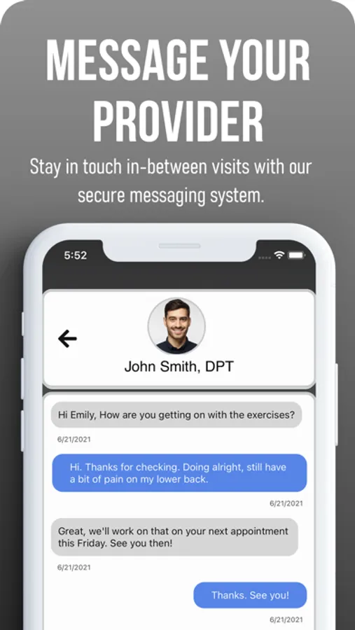 Using this app, you can access your personalized Home Exercise Program with HD Instructional videos. On the 'Messages' tab, you can securely communicate with your Peak Physical Therapy provider. As you complete your exercises, we'll give you trophies and medals to celebrate your progress!