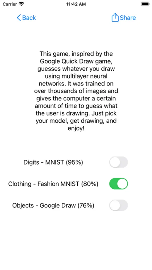 Drawnet is a fun and competitive game that combines drawing and machine learning. The user is prompted to draw an object or digit and the computer then tries to guess what it is. If the computer guesses correctly within a certain amount of time, the user wins! If the user is too slow or too bad of an artist, the computer wins! Feel free to change the dataset you are drawing and share it with friends!