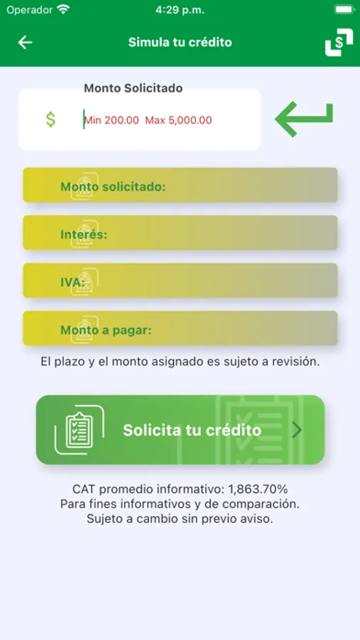 Si solicitas $1,200.00 a pagar en 61 días, tendrás que pagar $687.13 de interés sin ninguna comisión e IVA (16%) El monto total a pagar sería de $1797.07.