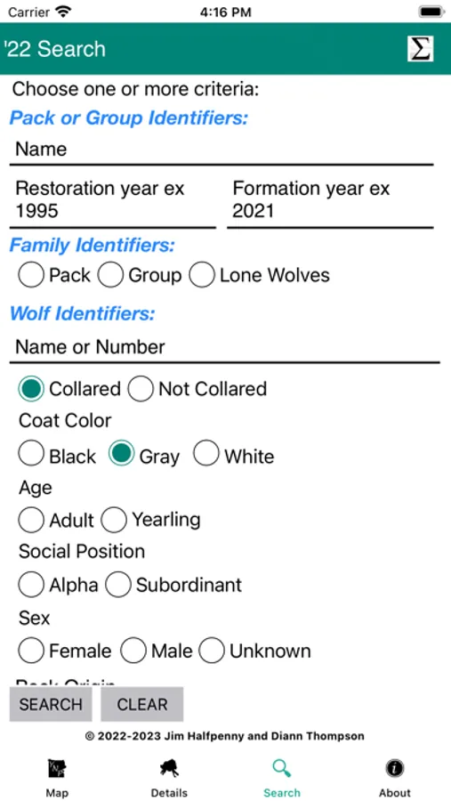 - Search - criteria to select a specific set of Packs & Wolves in the Details screen