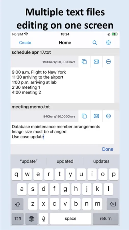 You can edit text boxes installed in multiple windows (table view cells) in parallel. Furthermore, you can quickly attach and send those files by email in txt file format.
