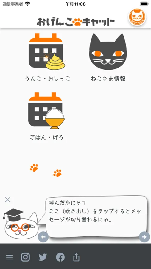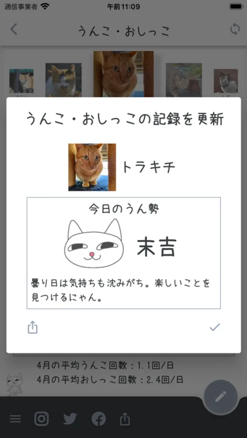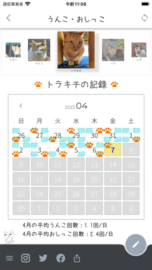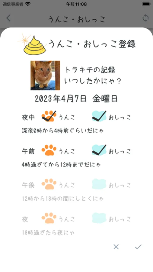 夜中、朝、昼、晩の4つの時間帯に分けて記録出来ます。「最後にお通じがあったのはいつ?」や「最近のお通じの大まかな周期は?」ぐらいの指標になります。オシッコも記録出来ます。