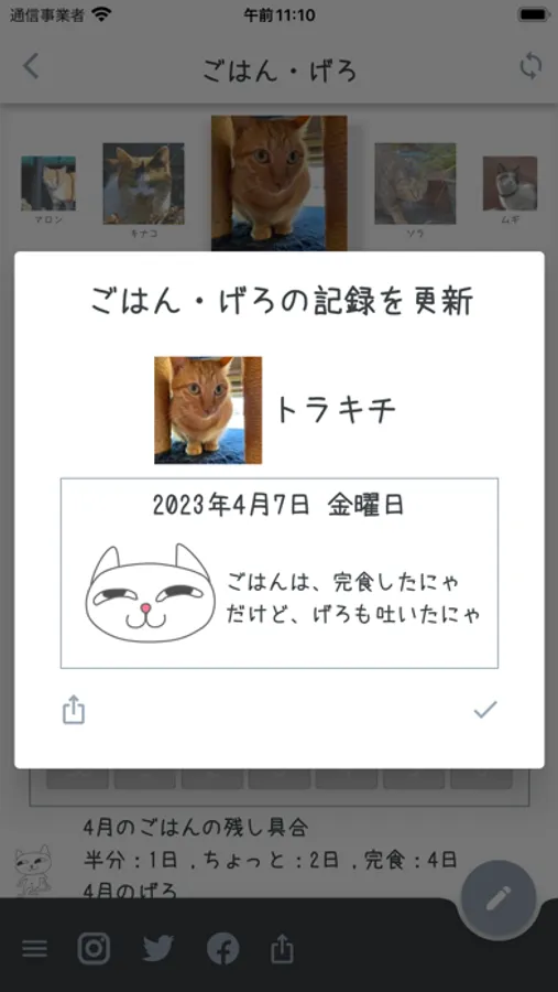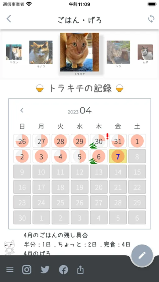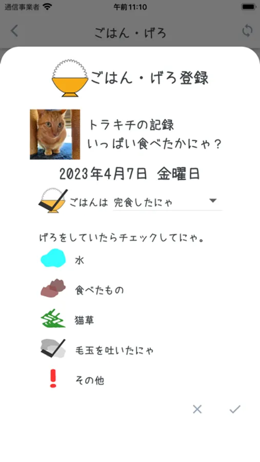 1日でどれだけごはんを食べたかを記録出来ます。「完食(100%)」、「少し残した(75%)」、「半分残した(50%)」、「ほとんど残した(25%)」、「全部残した(0%)」の様に大体の量を記録出来ます。カレンダーに円グラフで表示します。ゲロを吐いた場合は、「水」、「食べたもの」、「猫草」、「毛玉」、「その他」から選んで記録出来ます。