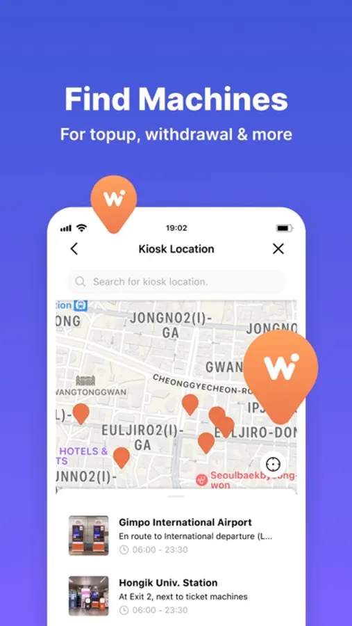 - Search on a map for nearby WOW Exchange machines located around Korean subways, hotels, and hotspots.