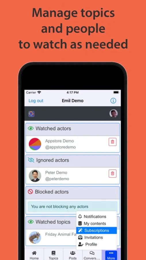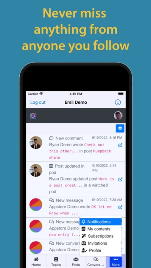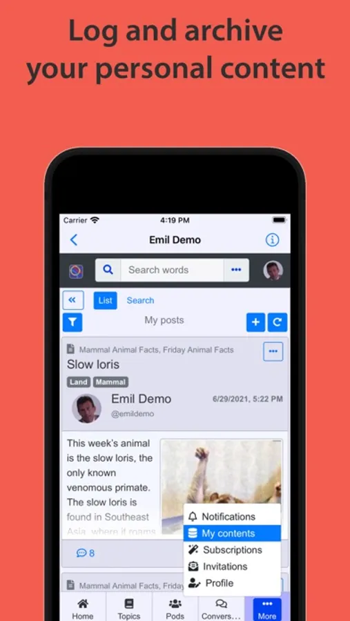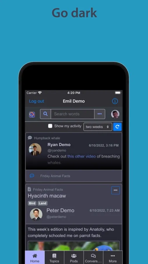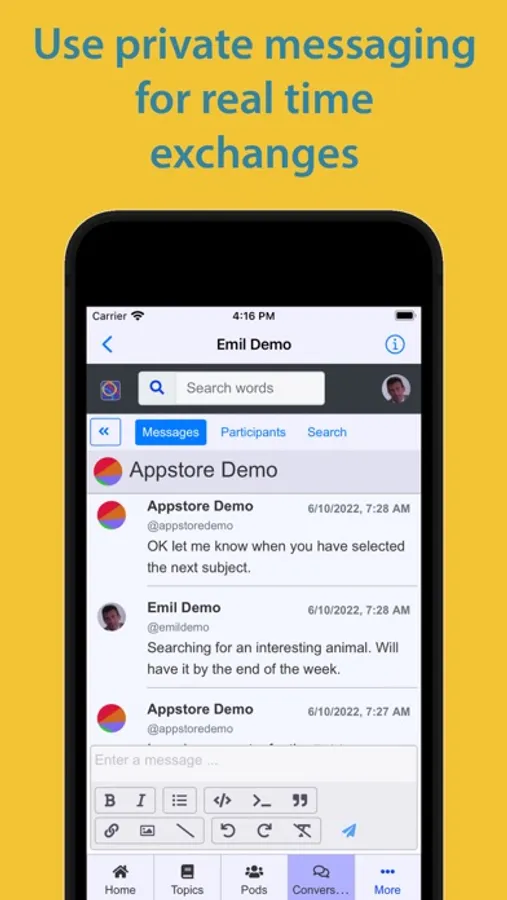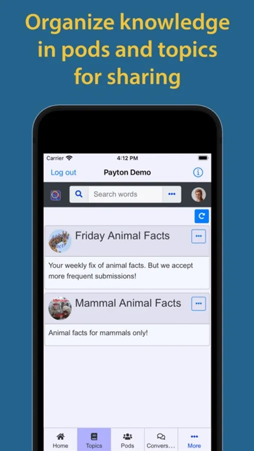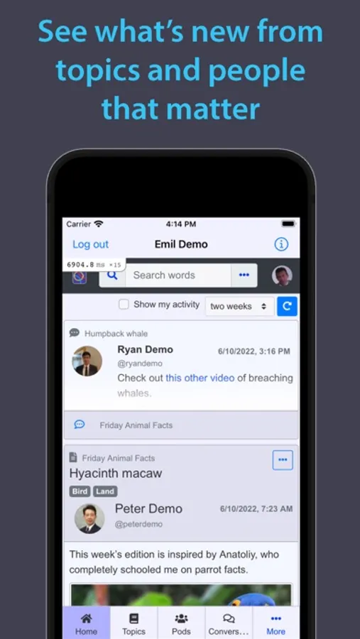 - Pods are used for grouping people and Topics are for capturing stories, conversations and events