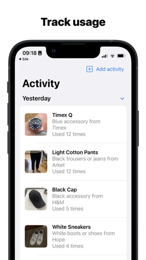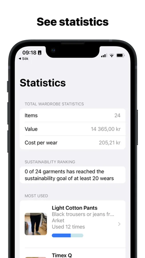 By tracking your garment usage you can learn what you use and don’t use to make more conscious consumption decisions in the future. By using Hållbar you can go back in time and see what items and outfits you’ve used earlier and see statistics on which items you use most, the total value of your wardrobe and cost per wear.