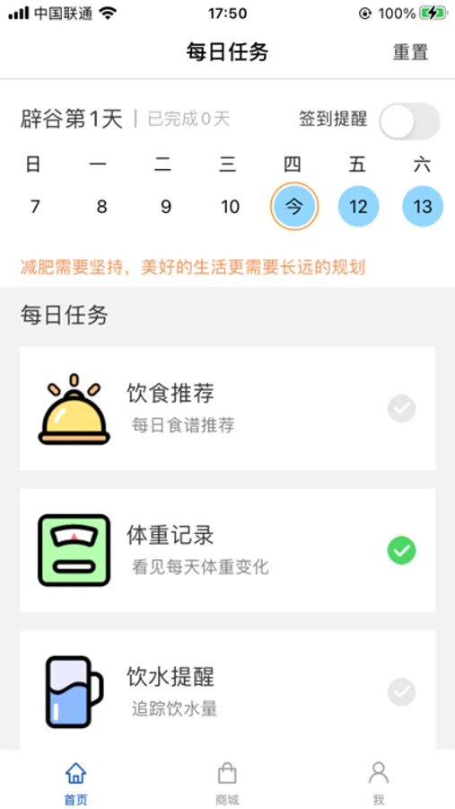 断食期间饮水量尤为重要,通过记录您的饮水量来达到每日要求,这样有助于您更好的完成模式,放空心灵修身养性。