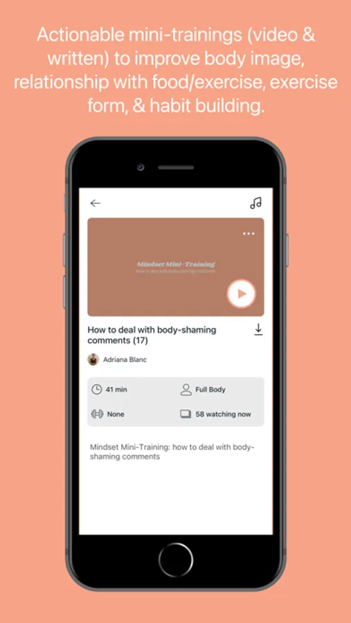 - Mindset videos: 15-40 minute mini-lessons with Adriana to help improve your relationship with your body, exercise, and food. Examples include: how to let go of the 'all or nothing' mindset, how to compassionately approach exercise when you don't 'feel like it', what to do on a bad body image day, tools to lesson comparing your body to others, letting go of food guilt.