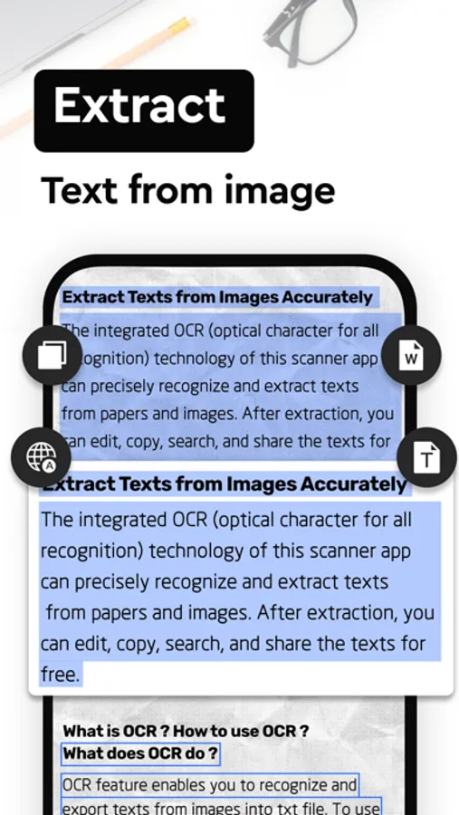• OCR (optical character recognition) feature recognizes texts in document images,and translate text into 20+ languages.