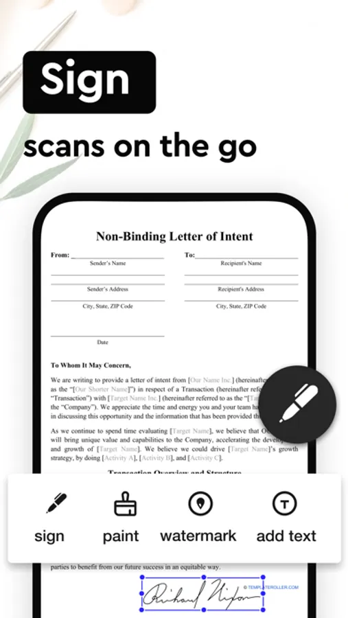 • PDF Scanner allows you to add electronic signatures to the scan results. Easily sign your PDFs or JPGs before sending and printing them.