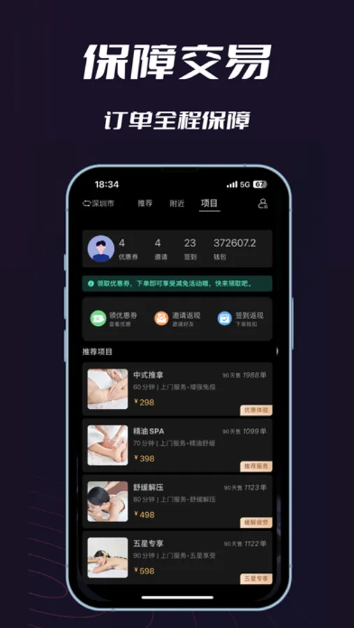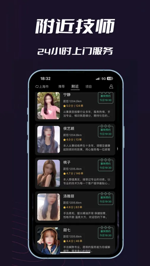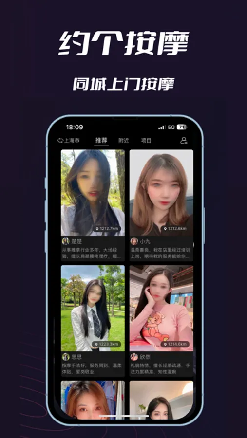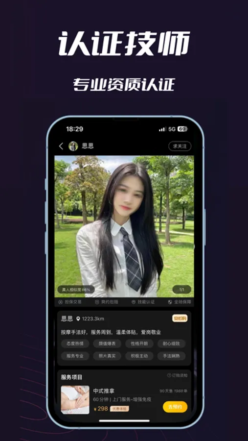 约个摩是同城上门按摩预约服务平台,技师通过平台真人认证审核,资质审核,拒绝虚假。保证优质的服务体验。您可以随时随地预约体验优质的服务。