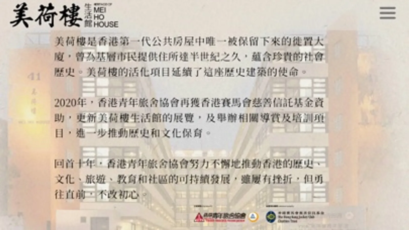 In 2020, the Hong Kong Youth Hostels Association (HKYHA) received funding support from The Hong Kong Jockey Club Charities Trust to revamp the exhibition at the Heritage of Mei Ho House, and organise guided tours and training programmes through the Jockey Club Cultural Heritage Programme@Mei Ho House to promote the conservation of history and culture.