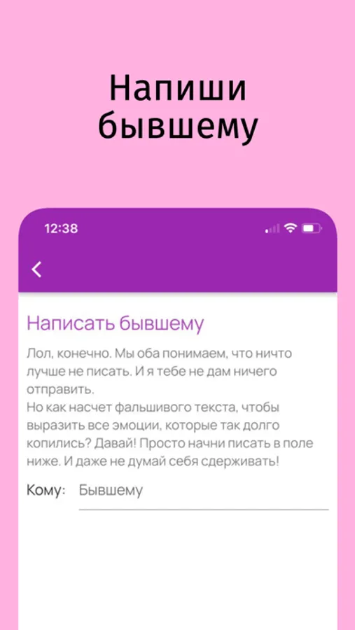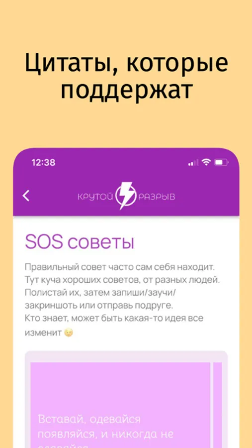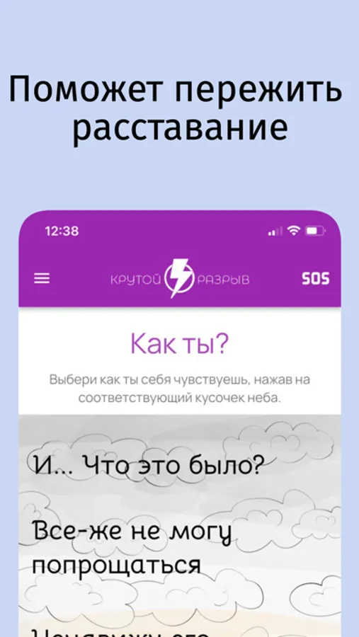Это приложение помогает пережить боль и грусть расставания, помогает выдержать удар эмоций, не наделать глупостей. Можешь считать, что техники описанные в этом приложении, настолько эффективны, что их можно сравнить разве, что с атомным взрывом! Ты забудешь про мороженое и телевизор, и снова поднимешь высоко голову, и обретешь крылья. Я помогу вернуть тебе твою самооценку, но будь осторожна, ты будешь владеть супермощными техниками и используй их во благо. Или посоветуй это приложение подруге, которая недавно рассталась со своим парнем.